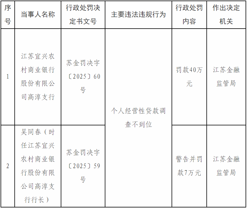 行政处罚信息公开表显示,因个人经营性贷款调查不到位,宜兴农商行高淳支行被江苏金融监管局罚款40万元。